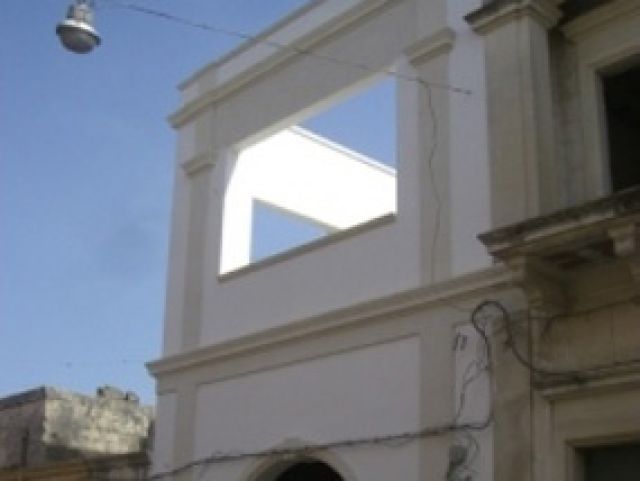 Una vetrina con alcuni dei lavori svolti dalla ditta Quarta edilizia nella ristrutturazione di edifici.